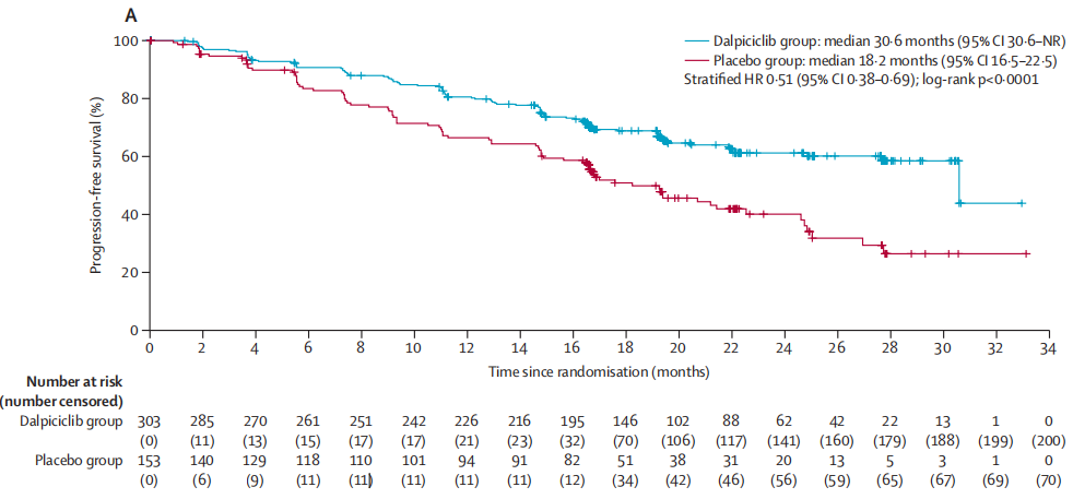 评估达尔西利联合来曲唑/阿那曲唑一线治疗HR+/HER2-晚期乳腺癌的疗效与安全性的DAWNA-2研究也获得了令人鼓舞的结果,PFS延长了12.4个月(30.6 vs. 18.2个月),HR=0.51,降低了49%的疾病进展风险(图3),DAWNA-2研究刷新了CDK4/6抑制剂联合非甾体类芳香化酶抑制剂一线治疗HR+/HER2-晚期乳腺癌的PFS和ORR记录,为药物的临床应用提供了强有力的循证证据。该结果已经于2023年5月在线发表在《柳叶刀·肿瘤学》(The Lancet Oncology,影响因子51.1)。