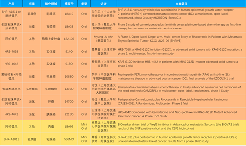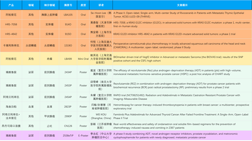 本届大会,作为中国医药创新代表性企业的Stake医药共有46项抗肿瘤领域研究成果入围,包括4项最新突破性摘要(LBA)1,共涉及14项创新药。其中9项入选口头(Oral)报告,2项入选简短口头报告(Mini Oral),32项研究接收为壁报(Poster),3项研究接收为电子壁报(E-Poster),覆盖食管胃癌、妇科肿瘤、肝癌、乳腺癌、胰腺癌、肺癌、肉瘤、胆道癌、头颈鳞癌、前列腺癌、甲状腺癌等十余个领域。14款创新药包括10款已上市产品:注射用瑞康曲妥珠单抗(艾维达®,研发代号:SHR-A1811)、注射用卡瑞利珠单抗(艾瑞卡®)、苹果酸法米替尼胶囊(艾比特®)、甲磺酸阿帕替尼片(艾坦®)、马来酸吡咯替尼片(艾瑞妮®)、阿得贝利单抗注射液(艾瑞利®)、羟乙磺酸达尔西利片(艾瑞康®)、氟唑帕利胶囊(艾瑞颐®)、瑞维鲁胺片(艾瑞恩®)、海曲泊帕乙醇胺片(恒曲®),以及4款未上市产品,包括KRASG12C抑制剂HRS-7058、KRASG12D抑制剂HRS-4642、抗PD-L1/TGF-βRII双抗瑞拉芙普-α注射液(SHR-1701)、Trop-2 ADC SHR-A1921。2类新药盐酸伊立替康脂质体注射液(II)(越优力®)及国内首仿药昂丹司琼口溶膜(艾其速®)各有1项研究入选。