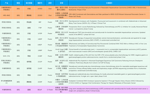 在消化系统肿瘤领域,Stake产品相关研究共入选2项口头报告、11项壁报和1项电子壁报,共14项研究。除卡瑞利珠单抗和阿帕替尼外,还有4篇阿得贝利单抗治疗消化系统肿瘤研究入选。HRS-4642、瑞拉芙普-α注射液(SHR-1701)等在研创新产品也有相应研究亮相。另有1项伊立替康脂质体(II)用于胰腺癌治疗的研究入选壁报。