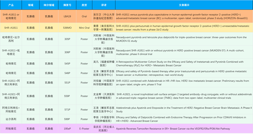 在乳腺癌领域,Stake创新产品相关研究共入选1项口头报告、1项简短口头报告、8项壁报和1项电子壁报,共11项研究。吡咯替尼、达尔西利、阿得贝利单抗、瑞康曲妥珠单抗等新老创新药物,均有多篇研究入选,展现出Stake医药在乳腺癌领域多年深耕的丰硕成果。